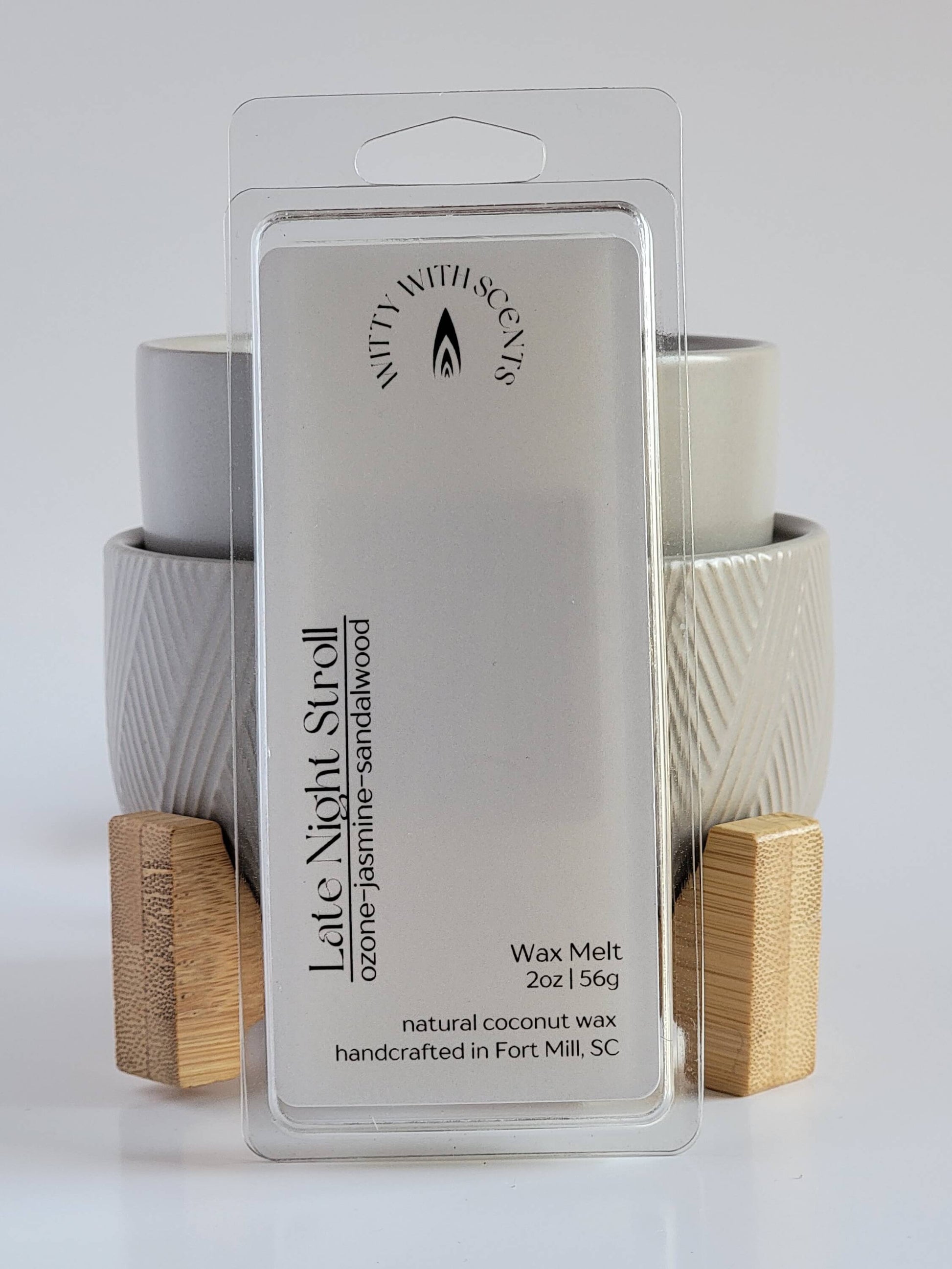 Late Night Stroll Wax Melt, the perfect scent for a peaceful evening. With notes of Fresh Ozone, Lily, and Musk, this fragrance will transport you to a calm and serene atmosphere. Breathe in the fresh, clean scent and let it relax your mind and body. Enjoy the tranquility of a late night stroll anytime with this captivating scent.